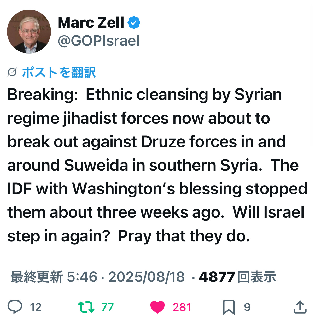 אל ג'ולאני וסביבתה, ממשלת סוריה, מבצעת טיהור אתני, המכוון נגד הדרוזים והמיעוטים. הדרוזים זקוקים נואשות למסדרון מאובטח על ידי צה"ל. אני מאמין שברכתה של וושינגטון לדרוזים תהיה משמעותית מאוד עם התמיכה בפועל של ממשלת ישראל.