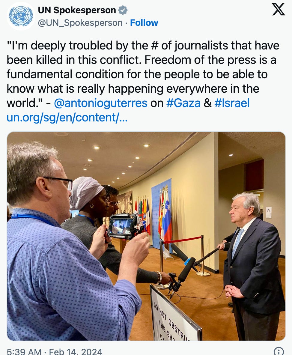I am not writing all these out of curiosity. On February 14th this year, there was a post from the UN Spokesman as follows. This is the statement of UN Chief Antonio Guterres regarding the number of deaths of journalists who were killed in Gaza by January 14th. I have posted that journalists participated in the October 7th massacre in Israel. Many people now forget that the October 7th massacre is a war waged by Hamas.