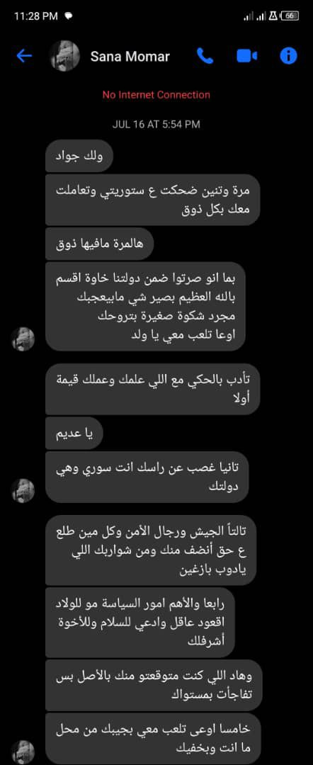 « Je veux te faire sortir de là où tu es et te cacher. Je veux faire pleurer ta mère sur toi.» Elle m’a envoyé de nombreux messages menaçant de me tuer, évoquant des figures religieuses et des choses qui pourraient salir ma dignité, et bien d’autres choses que vous pouvez voir sur les photos.