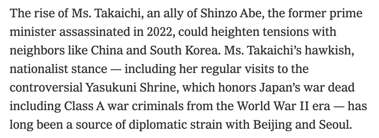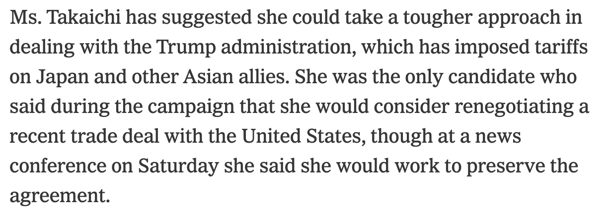 "Tougher” is not the right word from Ms. Sanae Takaichi. I listened to her speech, and I was actually very impressed at her modesty. Ms. Sanae Takeichi will place the United States as the most important ally in defense, economy, policy-making, and further. This victory of Ms. Takaichi is the new page for Japan to have much better relationship with the U.S. Looking at this coverage is like … a total disinformation.